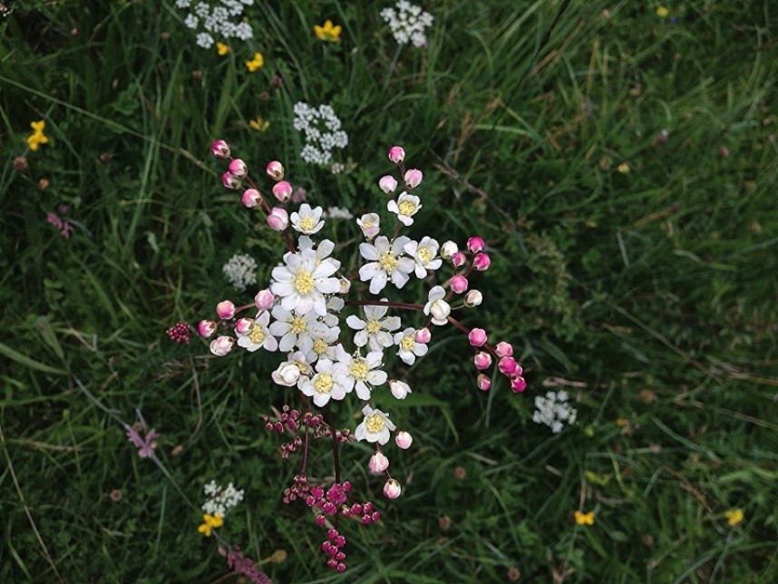 Unfortunately not all wild flowers grow so vigorously and commonly as Ox-eye Daisy. Many have become rare in the countryside. Dropwort is a good example of a flower which would have once been common across a large swathe of land from eastern Yorkshire to Cumbria in the west, following the line of calcareous soils created by the underlying geology of chalk and limestone. I’m always on the lookout for Dropwort at this time of year, the flowering head can be a wonderful mixture of pink closed petals and white open flowers.