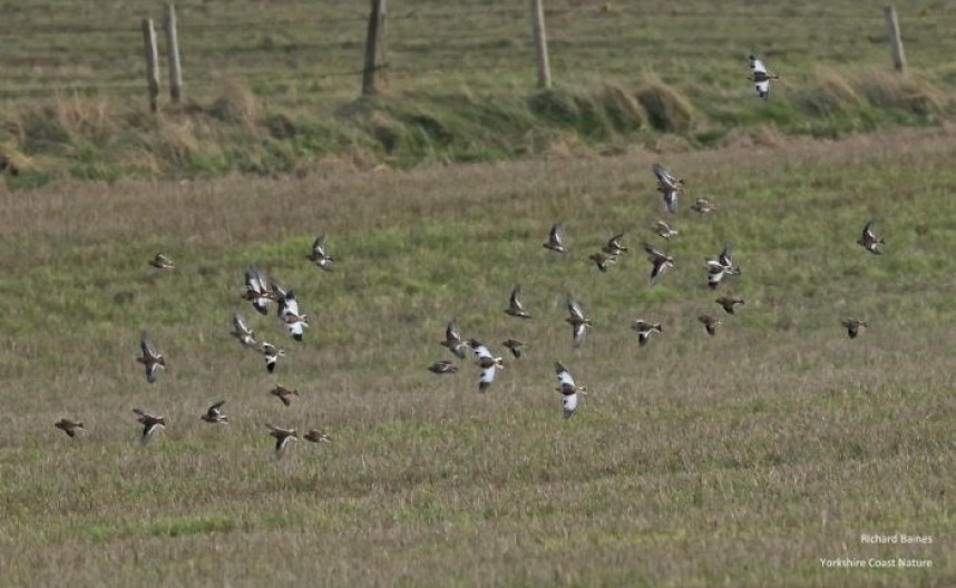I was hoping to see the wide range of winter songbirds that had been present in the cliff top stubble fields and grasslands recently. I wasn’t disappointed as a flock of around 60 Snow Buntings soon appeared.